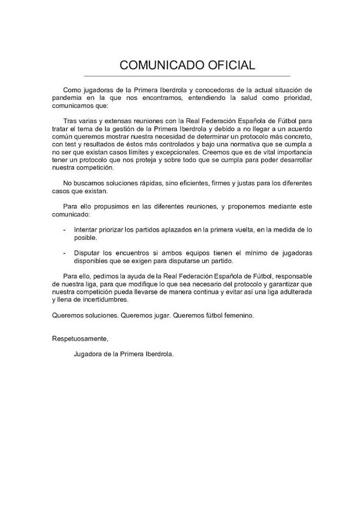 En este sentido, y para evitar una Liga «adulterada y llena de incertidumbres», explicaba que habían propuesto a la RFEF «intentar priorizar los partidos aplazados de la primera vuelta», que se están quedando sin huecos en el calendario, y establecer un protocolo que permita «disputar los encuentros si ambos equipos tienen el mínimo de jugadoras disponibles que se exigen para disputarse un partido». El comunicado se vio acompaña de un pequeño gesto público, el que protagonizaron las futbolistas durante el fin de semana, parando unos segundos en el arranque de los partidos.