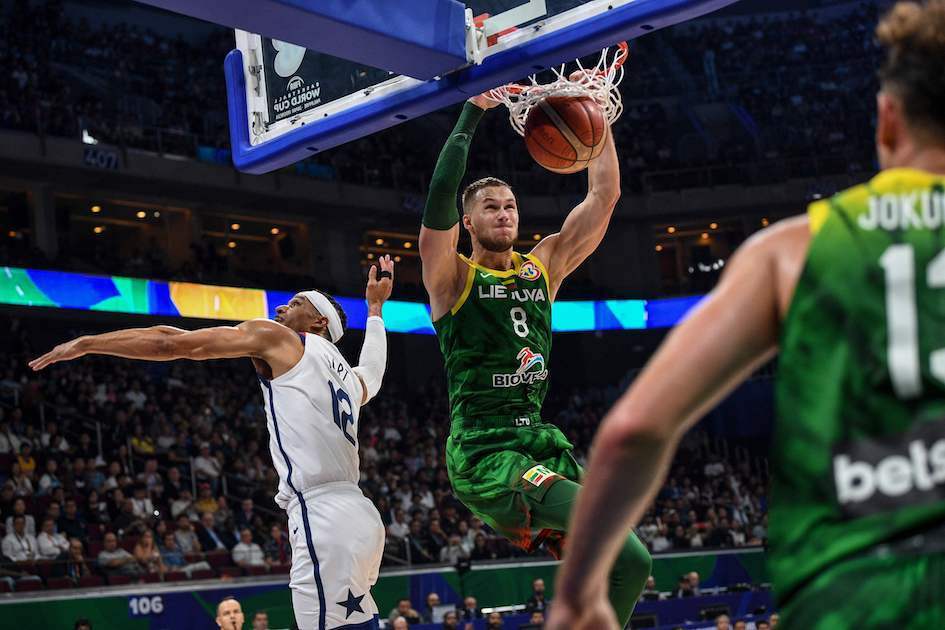 Y es que Lituania ha superado al combinado estadounidense por 104-110. Los entrenados por Kazys Maksvytis han apabullado a los norteamericanos en un primer cuarto de ensueño: 12-31, un resultado que ha mediatizado el partido. Lituania hace años que no es ese nido de excelsos tiradores, y menos aún teniendo en cuenta las bajas de Grigonis o Rokas Giedraitis en este torneo. Pero hete acá que el seleccionado báltico ha enchufado sus 9 primeros triples –para un total de 14 de 25 desde la larga distancia– y ha desquiciado por completo a un conjunto estadounidense que no ha reaccionado hasta después del descanso.