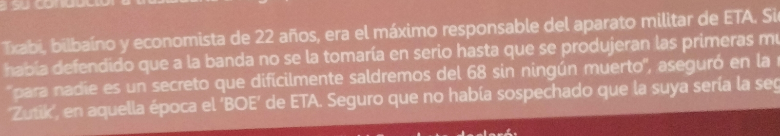 Este es el párrafo completo: «Txabi, bilbaíno y economista de 22 años, era el máximo responsable del aparato militar de ETA. Siempre había defendido que a la banda no se la tomaría en serio hasta que se produjeran las primeras muertes. "Para nadie es un secreto que difícilmente saldremos del 68 sin ningún muerto", aseguró en la revista ‘Zutik’, en aquella época el ‘BOE’ de ETA. Seguro que no había sospechado que la suya sería la segunda».