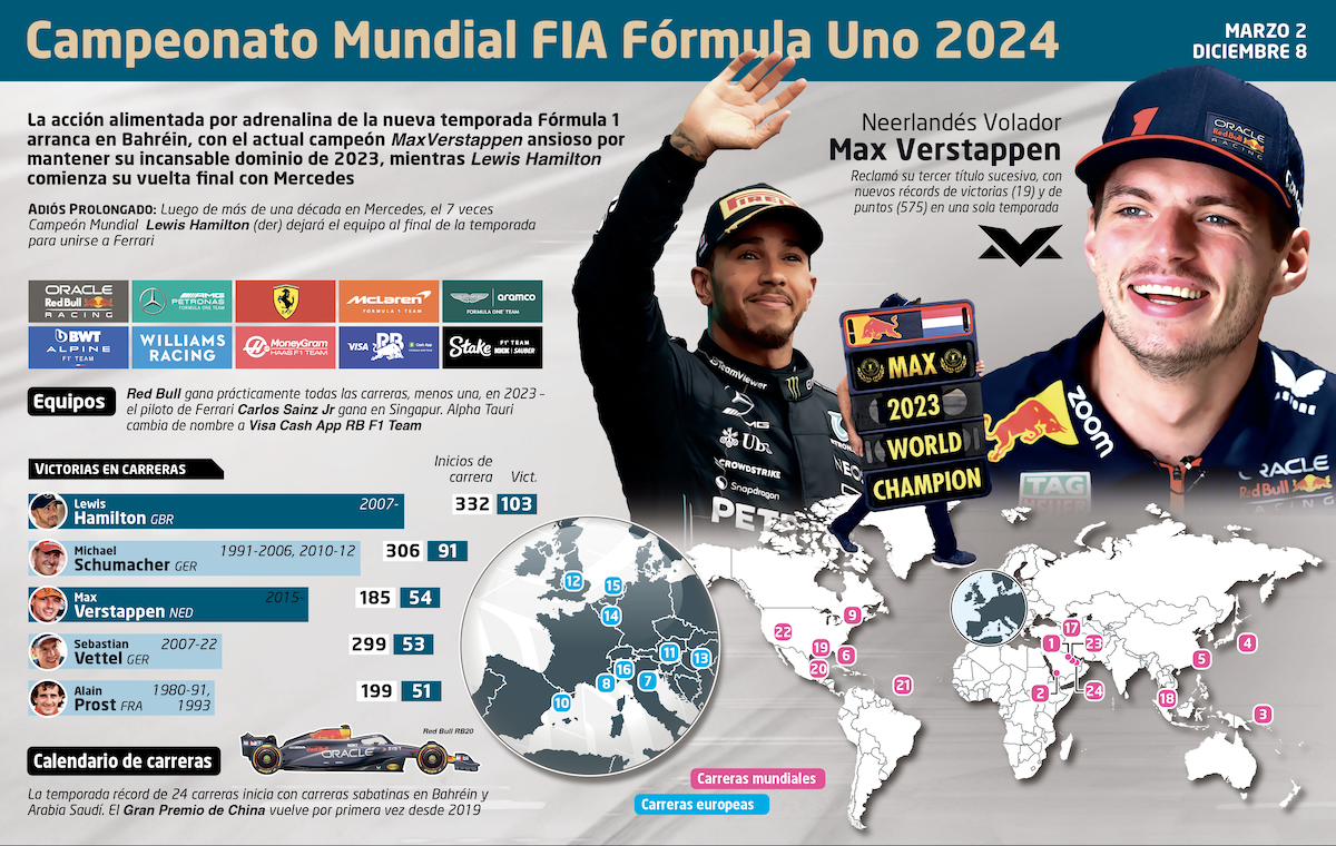 El neerlandés Max Verstappen (Red Bull), de 26 años y que el año pasado capturó un tercer título seguido –el más fácil para él, pues logró 19 victorias, sumando un total de 575 puntos y doblando la puntuación del segundo clasificado, el mexicano 'Checo' Pérez (Red Bull), que acabó con 285–, busca el póquer en el Mundial de Fórmula Uno, el más largo de la historia, de 24 carreras; que arranca esta semana con la disputa del Gran Premio de Bahrain.