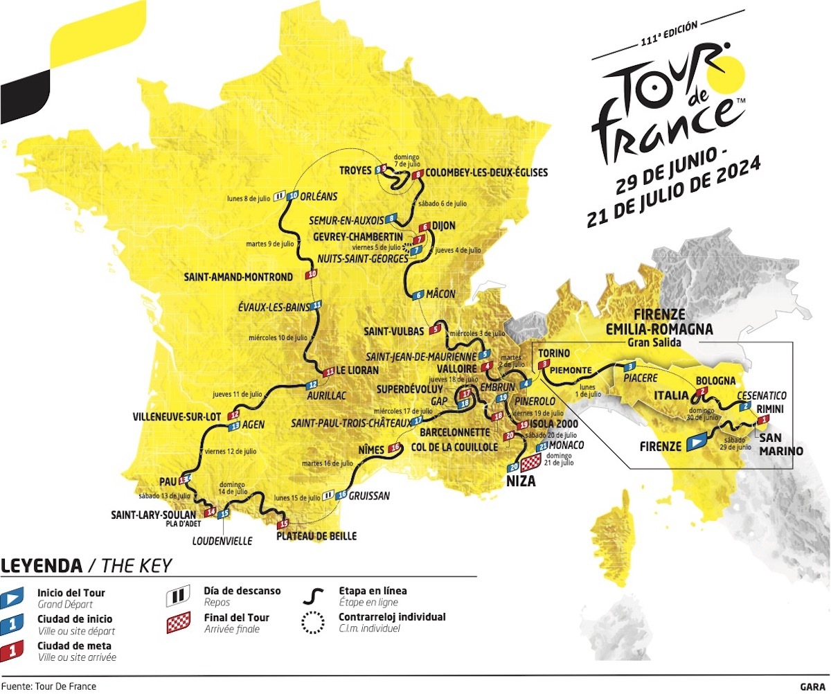 Y si la mejor prueba por etapas del mundo ya garantiza de por si el espectáculo, el que este año tenga un carácter inédito por influencia de la celebración de los Juegos Olímpicos en París le añade un plus de encanto. Empezando por su salida y final. Por primera vez, será en tierras italianas donde se le dará el pistoletazo de salida a la carrera, que concluirá con una contrarreloj –se está convirtiendo en tradición– en Niza, la otra novedad. En total, 3.492 kilómetros de recorrido, con un desnivel global de 52.230 metros, casi 7.600 más que el pasado Giro.
