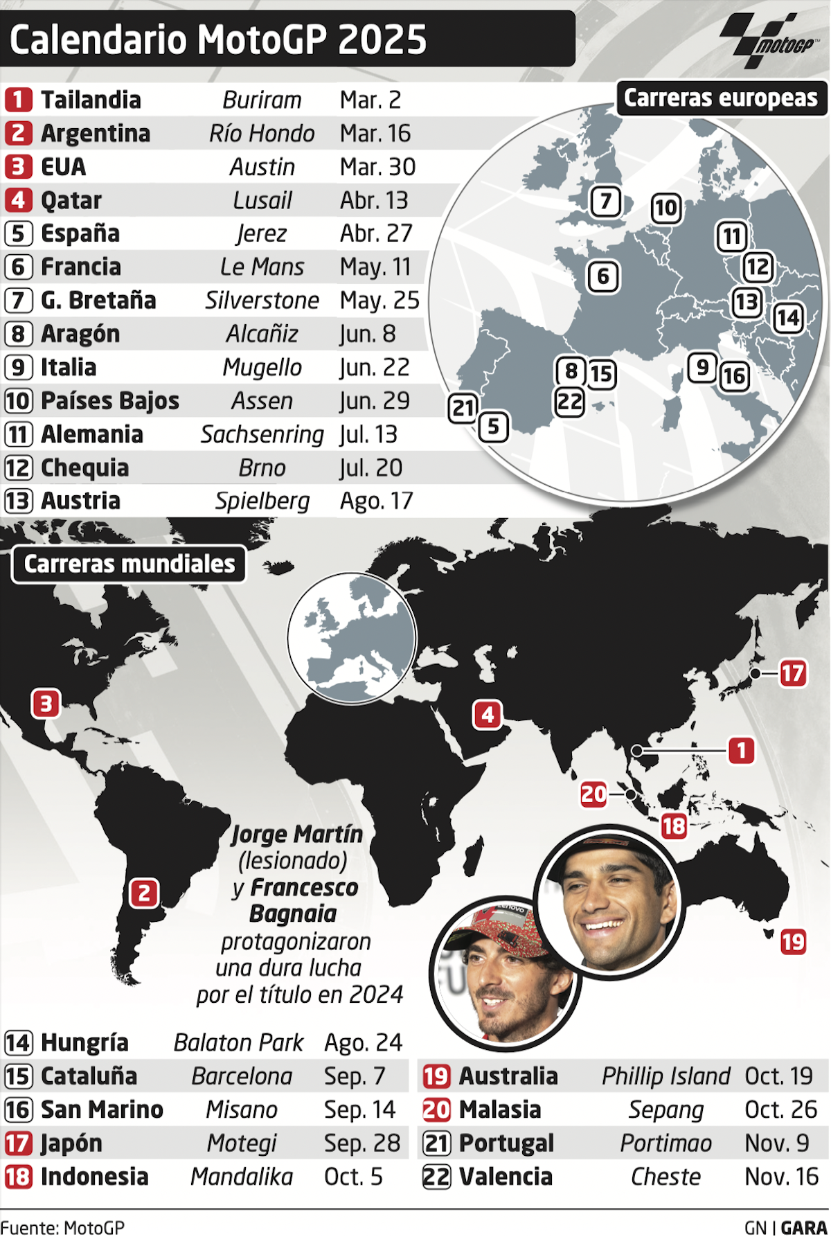 Por lo demás, el respeto entre ambos es mutuo... hasta que los semáforos se apaguen. En la primera carrera, este fin de semana en Tailandia, tienen una ‘ayuda extra’, ya que Jorge Martín, vigente campeón del mundo, se pierde el inicio de la nueva temporada tras sufrir este lunes una lesión en la mano izquierda.