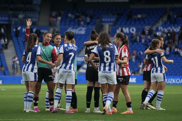 El podio lo sigue completando la Real, que rescató un punto sobre la bocina en el derbi. Agote adelantó al Athletic mediado el segundo tiempo y Eizagirre restableció el empate en el descuento transformando un penalti. El punto aleja a las rojiblancas del descenso y permite adelantar, aunque solo sea por golaverage, a un Eibar que cayó con el Espanyol (1-2). Ambos tienen un colchón de cinco puntos sobre el descenso, en el que siguen los dos únicos equipos que todavía no han ganado, con once jornadas disputadas ya, DUX y Levante. El equipo granota, que apenas ha podido sumar dos puntos, ha fichado a Andrés París para sustituir a Santi Trigueros, entrenador interino desde el cese de Emily Lima, aunque no parece que el problema esté en el banquillo.