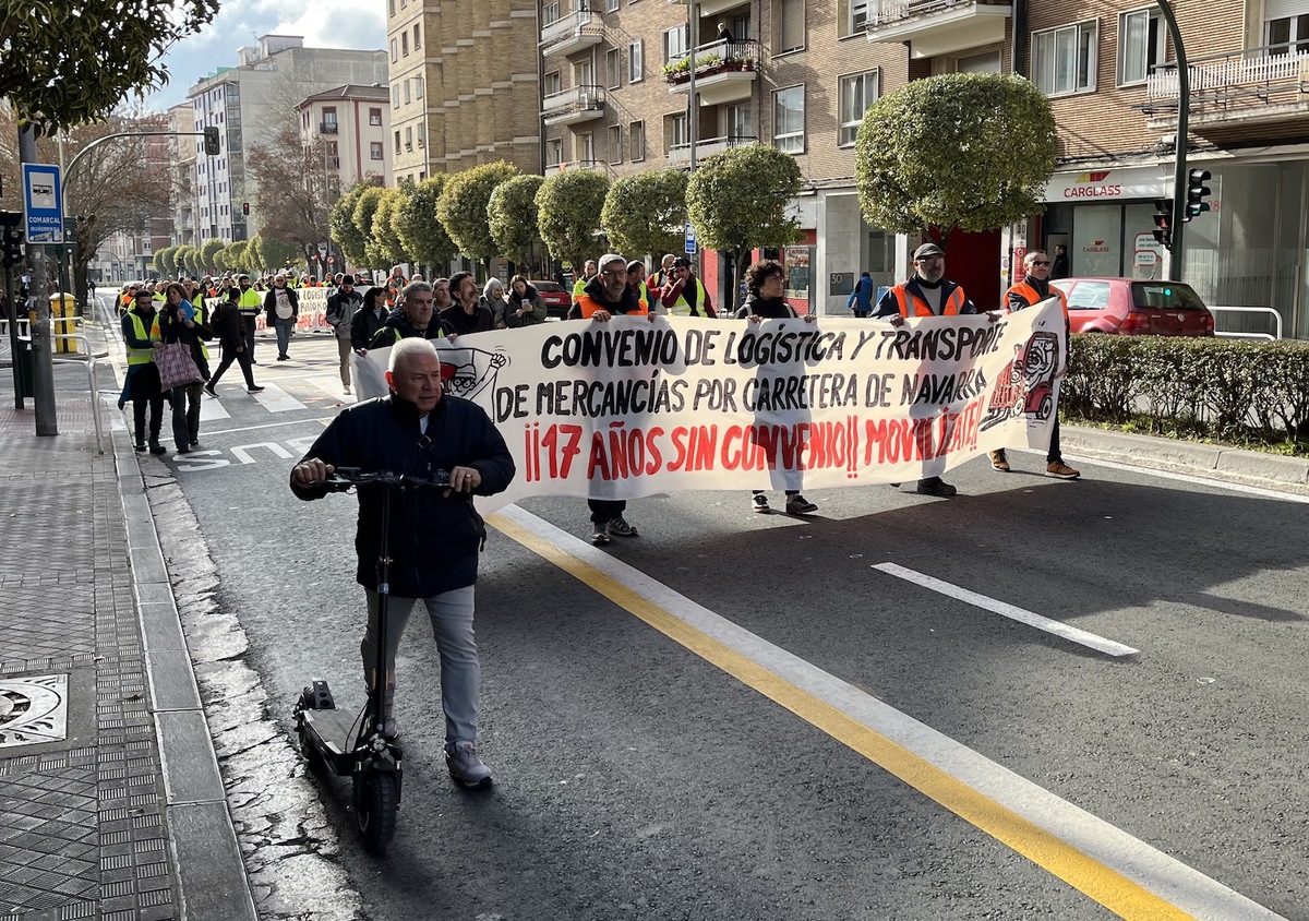 En la misma han participado unas cien personas que iban detrás de dos pancartas con el mismo mensaje: ‘Convenio de logística y transporte de mercancías por carretera de Navarra. ¡¡17 años sin convenio!! ¡¡Movilízate!!», la primera de ellas en castellano y la segunda, en euskara.