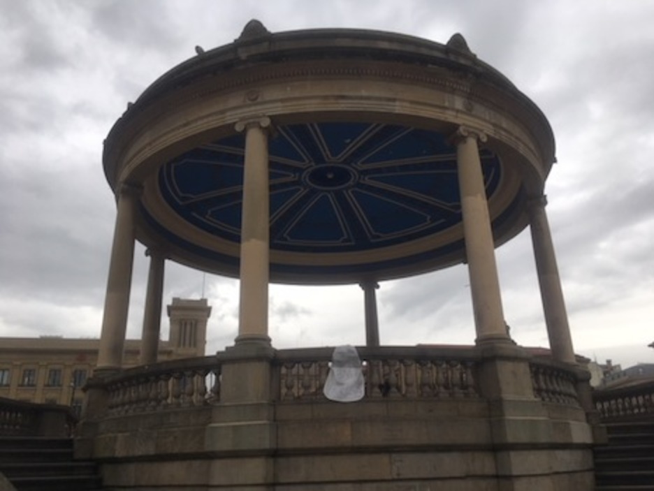 El delantal también ha sido colocado en el kiosco de la plaza del Castillo.