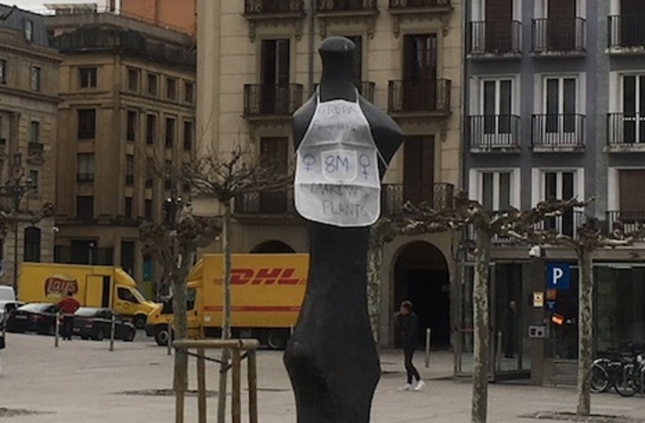 El delantal, símbolo de la jornada de reivindicación por la igualdad del 8M, se está haciendo presente en los más variados lugares de Iruñea. El Parlamento navarro lo ha colgado en su sede, en el kiosco de la plaza del Castillo también está presente e incluso lo lucen Hemigway y San Fermín en la cuesta de Santo Domingo.