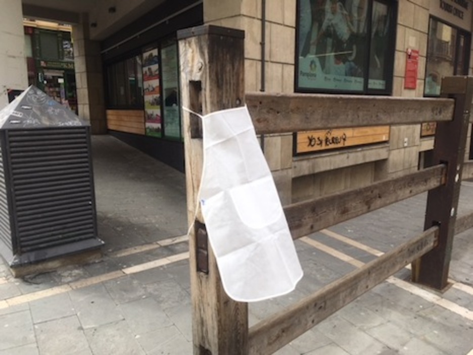 Los cánticos y los periódicos ante San Fermín en la cuesta de Santo Domingo han sido sustituidos por un delantal. (LAB)