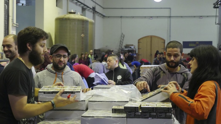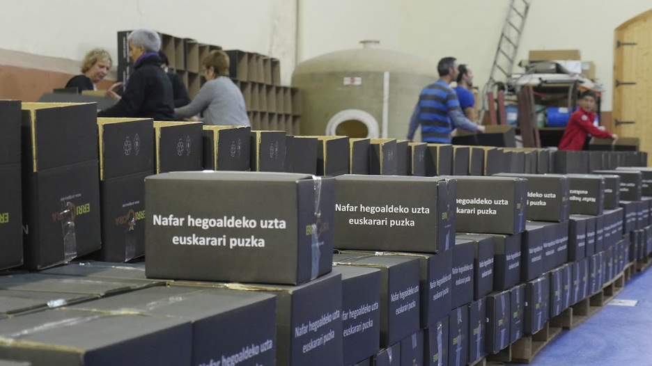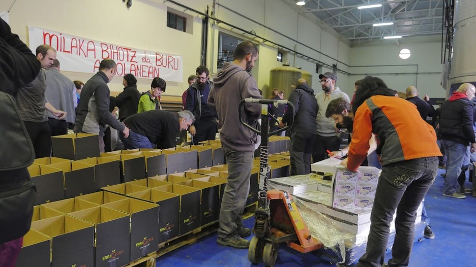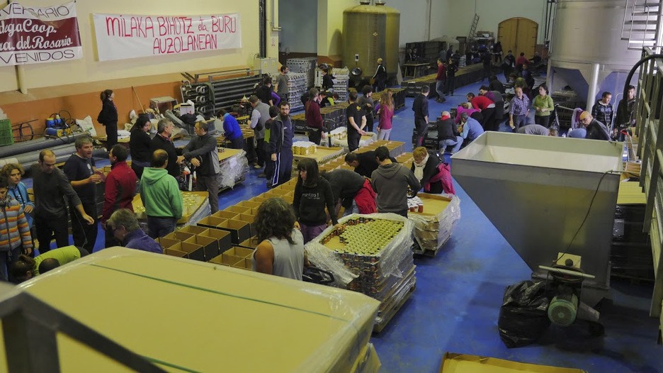 Ezin zintekeen bestela, auzolanean bukatu du Errigorak udazkeneko kanpaina. Giro ederrean 120 herritar inguru elkartu dira Ablitasen aurten saltzea lortu dituzten 12.000 kutxen muntaia lanean aritzeko. (ERRIGORAk berak igorritako argazkiak)