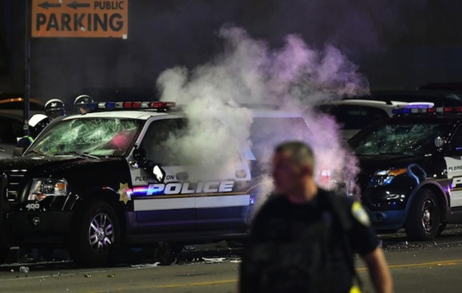 Vehículos policiales atacados en Oakland. (Josh EDELSON/AFP)