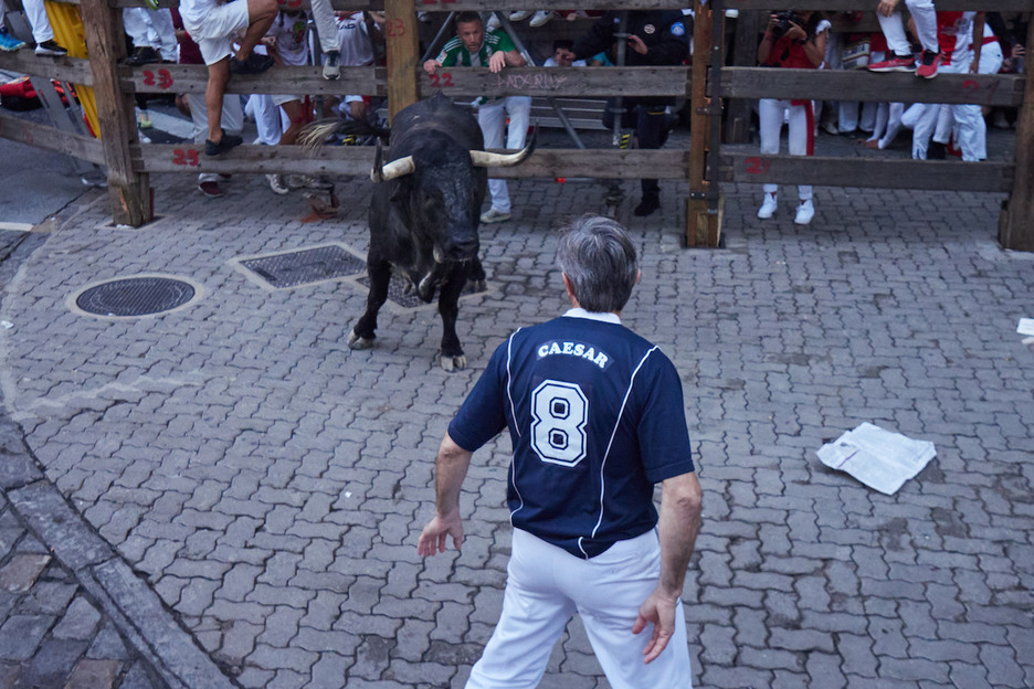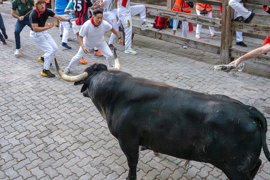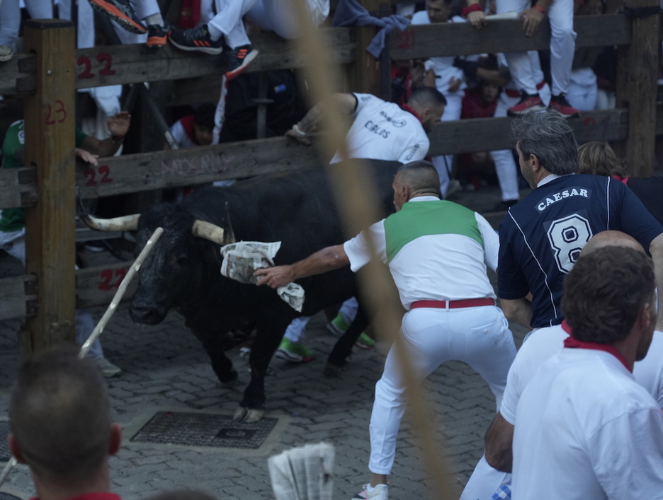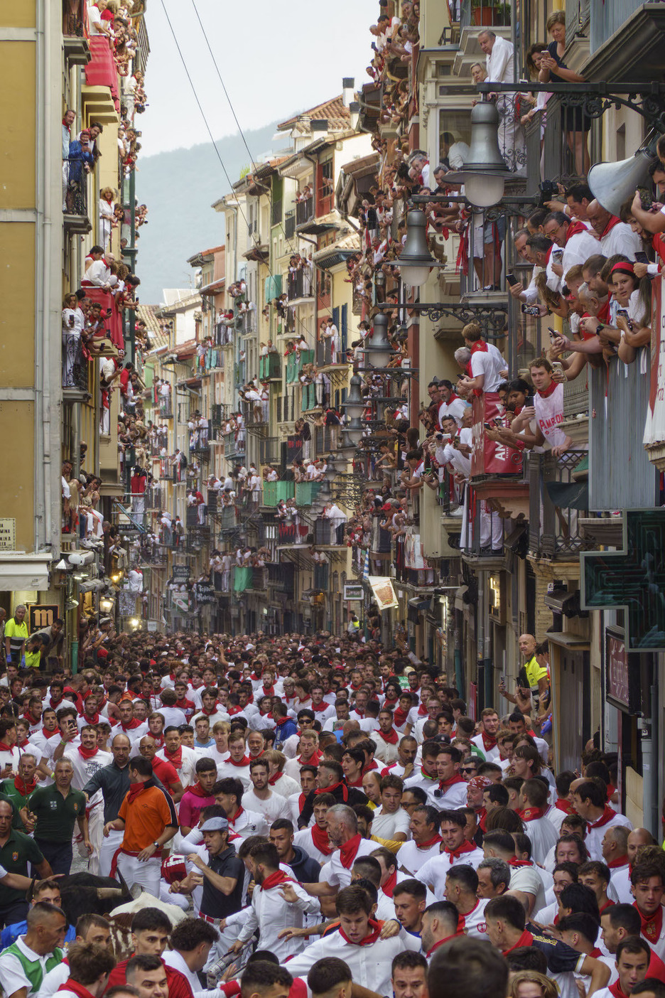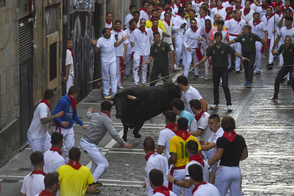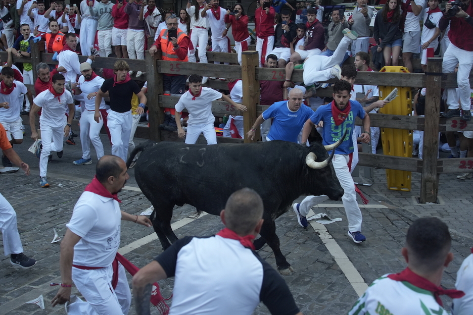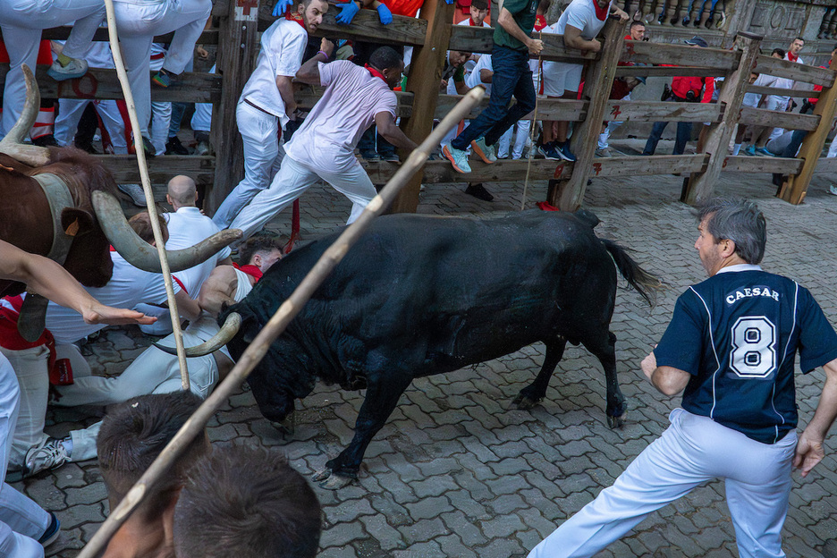 El Cebada Caminante, número 23, ha necesitado unos tres minutos extras para llegar a la plaza tras quedarse atrás en Estafeta. Corredores y pastores se han coordinado para evitar una tragedia.