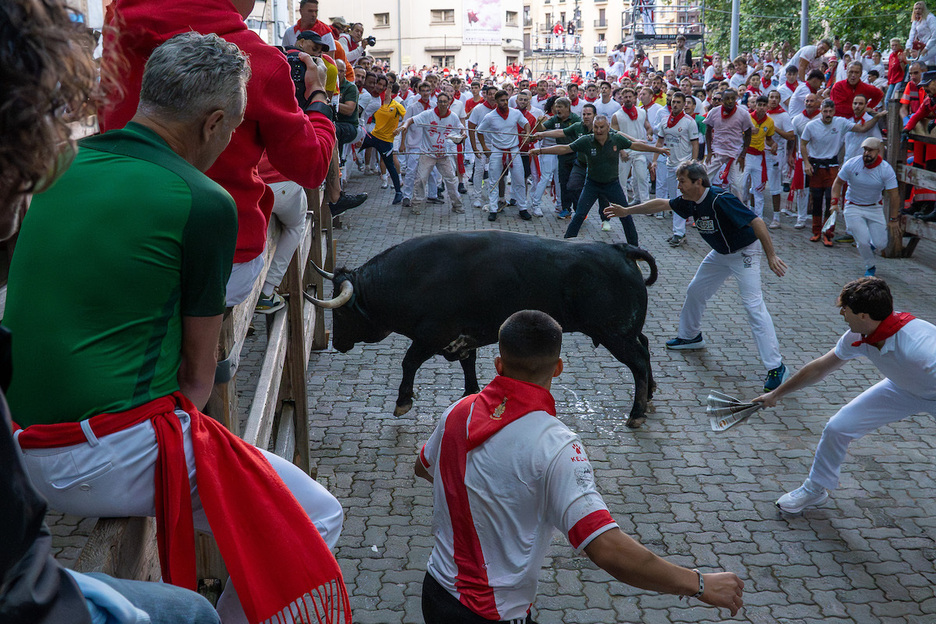 Los pastores impiden que el toro se vuelva. (Idoia Zabaleta | Foku)