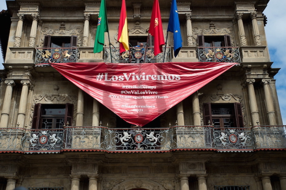 Udaletxeko balkoitik «Los viviremos-Biziko ditugu» leloa duen zapia zintzilikatu dute. (Iñigo URIZ/FOKU)