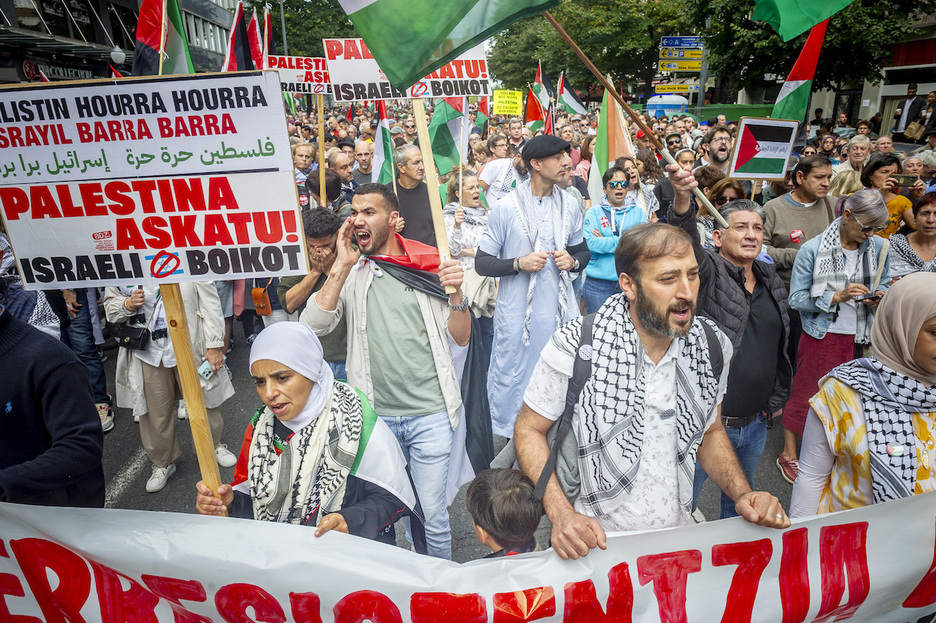 Palestinar herriaren erresistentzia eskubidea gorapaitu dute eta genozidioa amaitzea aldarrikatu dute milaka lagunek Bilboko kaleetan. Iruñean ere, arratsalde partean.