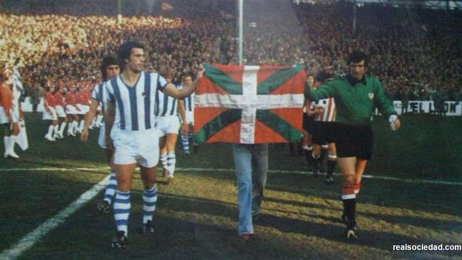 Y es que pocos años antes, cuando la bandera era perseguida y Manuel Fraga proclamaba que «para enarbolar esa bandera tendrán que pasar por encima de mi cadáver» –finalmente, murió en 2012–, el 5 de diciembre de 1976, al inicio del derbi entre la Real Sociedad y el Athletic, José Angel Iribar e Inaxio Kortabarria salieron al campo portando una ikurriña con todos los jugadores de ambos equipos detrás. Que dos equipos salieran al campo juntos era algo inédito en la época.