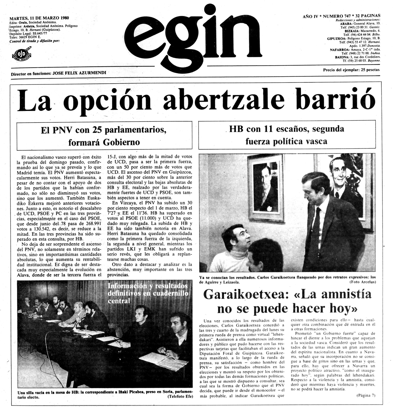 En aquel primer Parlamento vascongado el PNV consiguió 25 escaños, seguido de HB con 11 y el PSOE con 9. El entonces jelkide Carlos Garaikoetxea se hizo con la Lehendakaritza y la capital de la CAV se fijó en Gasteiz.
