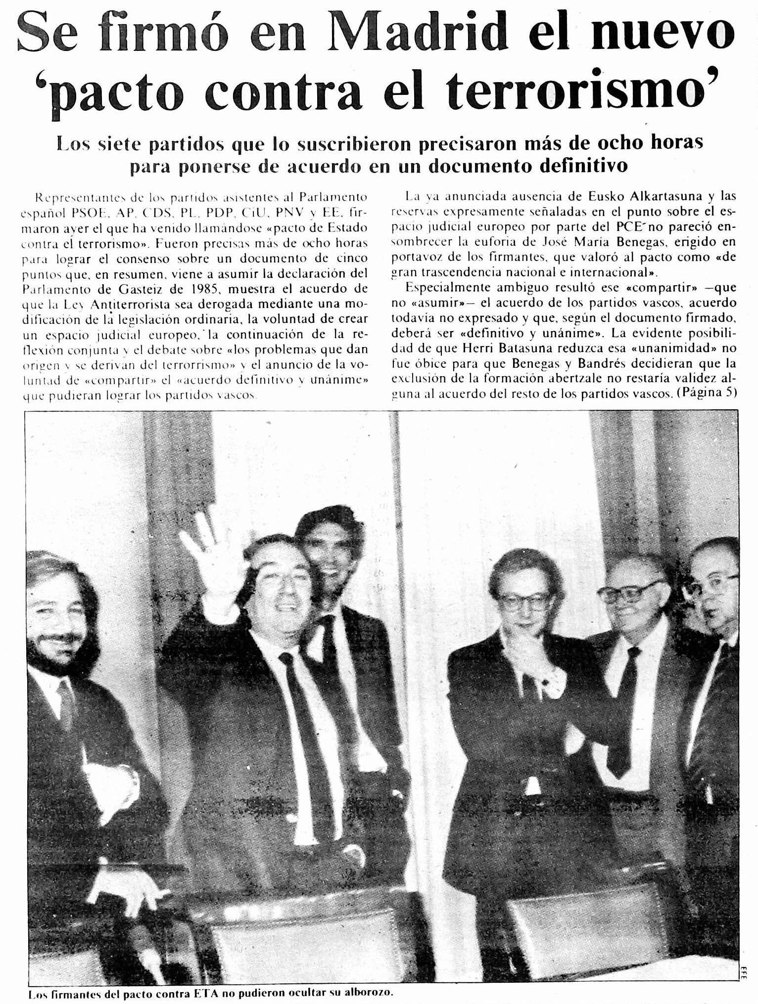 La ofensiva desatada por el PSOE buscó cobertura política en las conversaciones entre partidos que concluyeron en el llamado Acuerdo de Madrid contra el Terrorismo, firmado el 5 de noviembre. El Pacto partía de una resolución contra ETA aprobada dos años antes en el Parlamento de Gasteiz, colocaba el Estatuto de Gernika como eje, la represión como herramienta y animaba a Ardanza a lograr un acuerdo similar, que se traduciría al año siguiente en el Pacto de Ajuria Enea. EA no firmó el Pacto de Madrid al considerar que la iniciativa debía ser a la inversa y partir del Parlamento de Gasteiz.