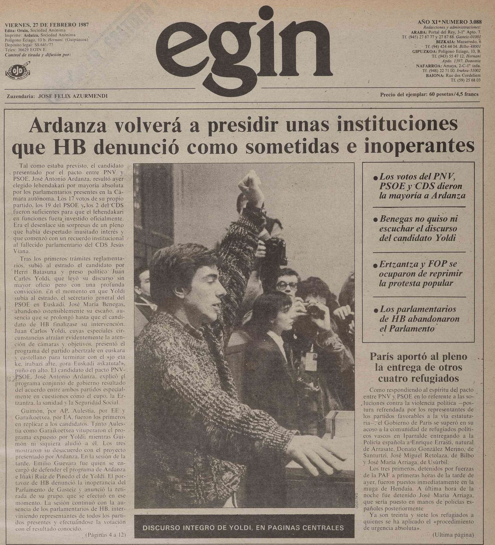 Como ocurrió durante 1987, cuando todo parecía conspirar para perpetrar un año convulso en el que abundaron los conflictos laborales reprimidos con violencia, varios pesqueros vascos fueron ametrallados en diferentes aguas, la situación de los prisioneros políticos vascos siguió empeorando, el Gobierno francés puso en el punto de mira a los refugiados, hubo atentados con consecuencias no deseadas, se firmó en Madrid un pacto de Estado contra ETA, el PNV y EA abrieron hostilidades por el reparto del patrimonio, Ardanza fue elegido lehendakari del tercio autonómico…