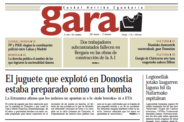 Donostiako Aste Nagusia amaitu eta berehala, abuztuaren 20an, gerra zikineko eraso bat Alde Zaharrean izan zen. Taberna batean abandonatutako jostailu batean kamuflatutako leherkari batek Maria Eraunzetamurgil hil zuen, eta haren 16 hilabeteko biloba larri zauritu.