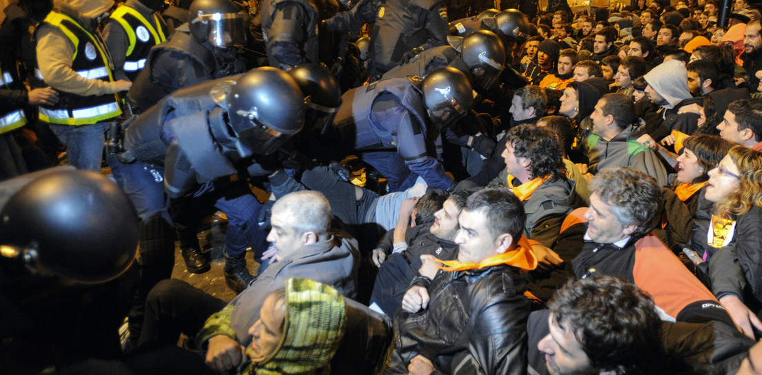 Guardia Zibilak egin zuen sarekada eta, bitartean, Ertzaintza protesten kontra oldartu zen. Haietako batean, ertzain batek borra-kolpez Amaiur koalizioko Amalur Mendizabal senatariari buruan zortzi puntuko zauria eragin zion.
