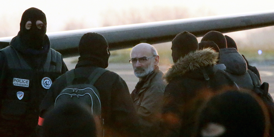 El artesano de la paz Mixel Berhokoirigoin es conducido en el aeropuerto de Biarritz al avión para trasladarlo a París tras su detención en Luhuso.