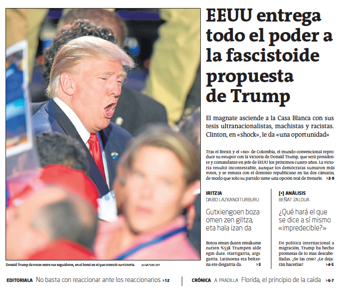 Fragmento de la portada de GARA del 10 de noviembre de 2016.