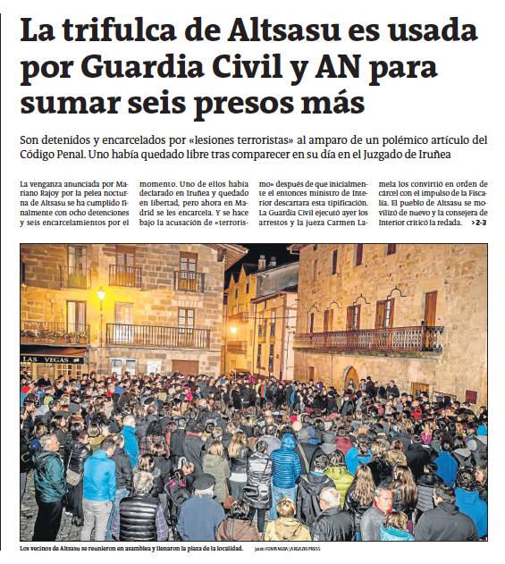 Y no solo no se movía, sino que incluso daba algún salto hacia atrás. Así ocurrió el 15 de octubre en Altsasu, donde una trifulca de taberna acabó con siete jóvenes en la cárcel y una acusación de «terrorismo» en la Audiencia Nacional. El motivo: entre los implicados había dos guardia civiles y sus parejas. Ahí se agarró Covite para llevar la causa a Madrid.