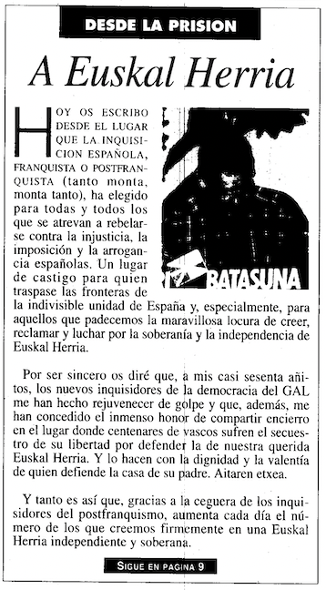 Quiero enviar desde esta celda un abrazo a mis compañeros de Herri Batasuna, a la Mesa Nacional, a todos vosotros, sin distinción, y deciros que me tenéis a vuestra completa disposición. Para todo lo que haga falta.