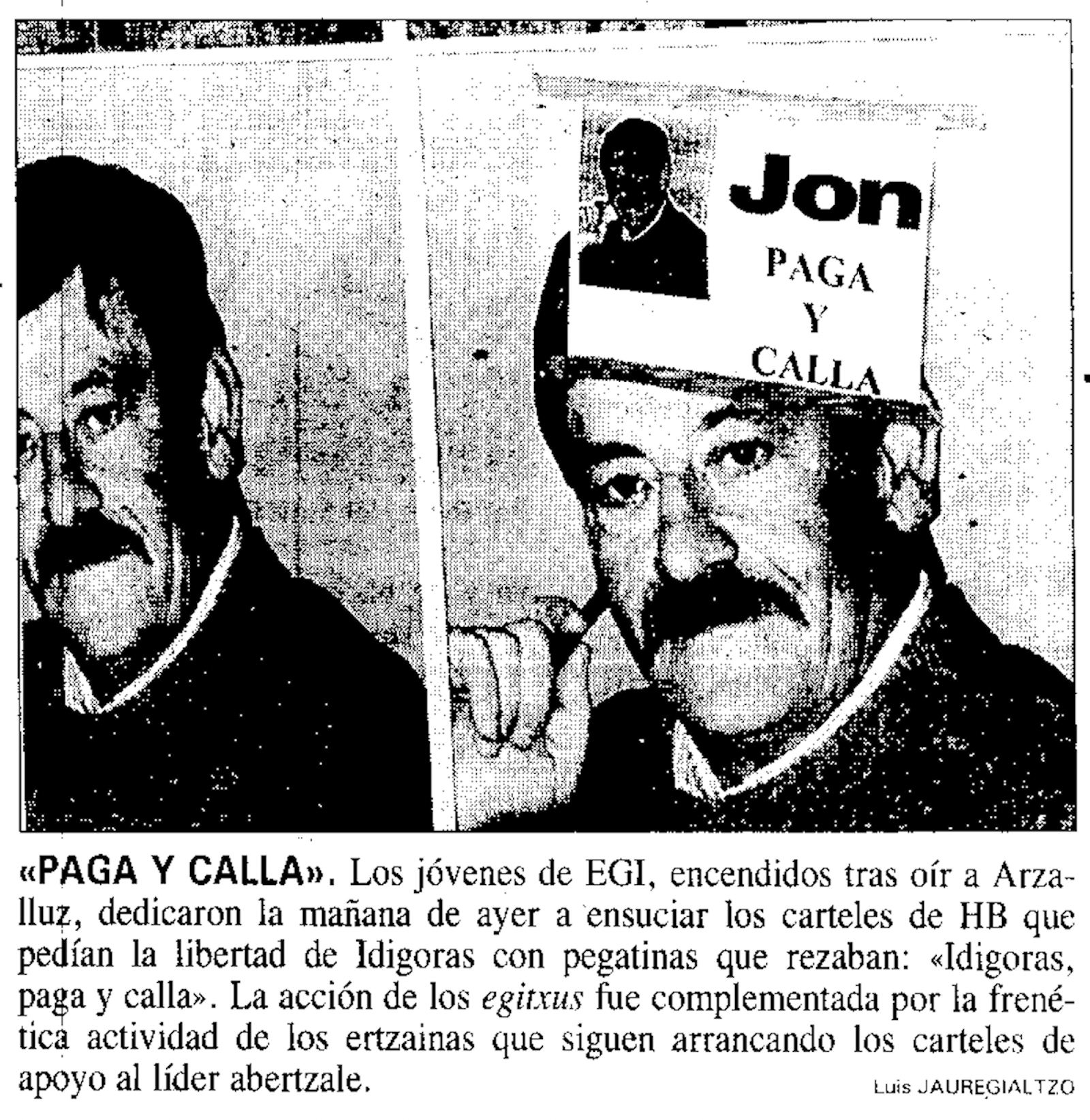 Antes de todo eso, aquel 24 de febrero, 'Egin' publicó una carta escrita por Idigoras de su puño y letra. Hay mucho del momento concreto, y otro mucho del carácter del hijo de Juanita Gerrikabeitia, que no ahorra piropos a sus carceleros ni a la Ertzaintza, que colaboró proactivamente en su detención y a la que señala por el trato mezquino dispensado: «Peor que la Guardia Civil, que ya es decir». Aquel mismo día, Arzalluz acusó a Idigoras de provocar su encarcelamiento y señaló que estaba «contento» en prisión. Tras ello, militantes de EGI decoraron carteles a favor de la libertad del zornotzarra con pegatinas en las que podía leerse: «Jon, paga y calla».