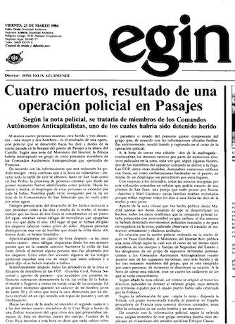Cierto es que en ese primer momento no solo este medio mostró dudas. Esto escribió 'El País' en su editorial: «La cuestión central sería establecer si la envenenada consigna de la Guerra del Norte ha sido interiorizada por el Gobierno socialista hasta el punto de sustituir los procedimientos de orden público por técnicas propias de un auténtico conflicto bélico». Era marzo de 1984 y no solo se trataba de Pasaia; unos kilómetros más al norte los GAL empezaban a encadenar muertes una tras otra.