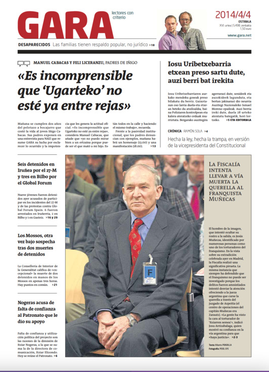 El excapitan de la Guardia Civil Jesús Muñecas compareció en la Audiencia Nacional el 3 de abril de 2014 para declarar ante la petición de extradición de la jueza argentina María Servini dentro de la querella contra los crímenes del franquismo. El tribunal de excepción rechazó la extradición pero el mundo puso cara al responsable de tan graves torturas.