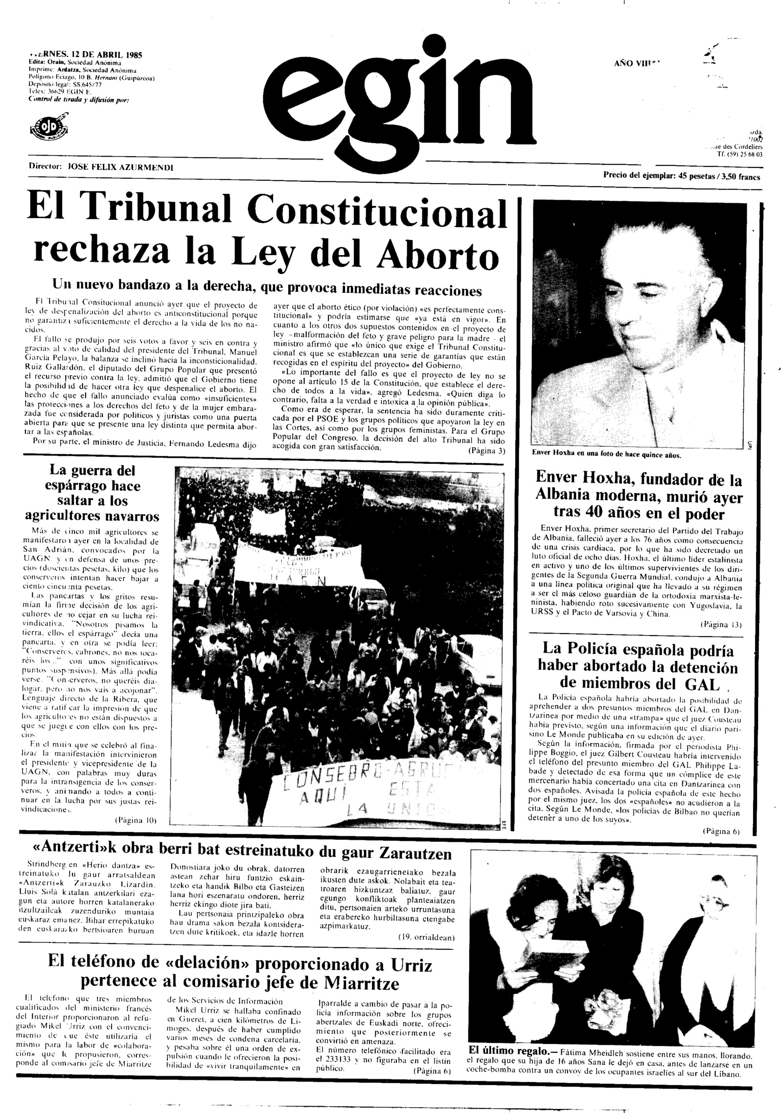 Justo un año después, el 11 de abril de 1985, la noticia fueron los «no nacidos». El Tribunal Constitucional español rechazó la Ley del Aborto alegando que era anticonstitucional «porque no garantiza suficientemente el derecho a la vida de los no nacidos». El fallo se produjo por seis votos a favor y seis en contra gracias al voto de calidad del presidente del Tribunal.