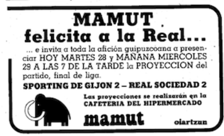 De este modo se organizaron proyecciones del partido de El Molinón que se jugó el domingo para el martes e incluso el miércoles. Da igual que se supiera ya el resultado, que incluso se mostraba en este anuncio del hipermercado Mamut de Oiartzun publicado en el ejemplar de 'Egin' del 28 de abril de 1981, dos días después del partido.