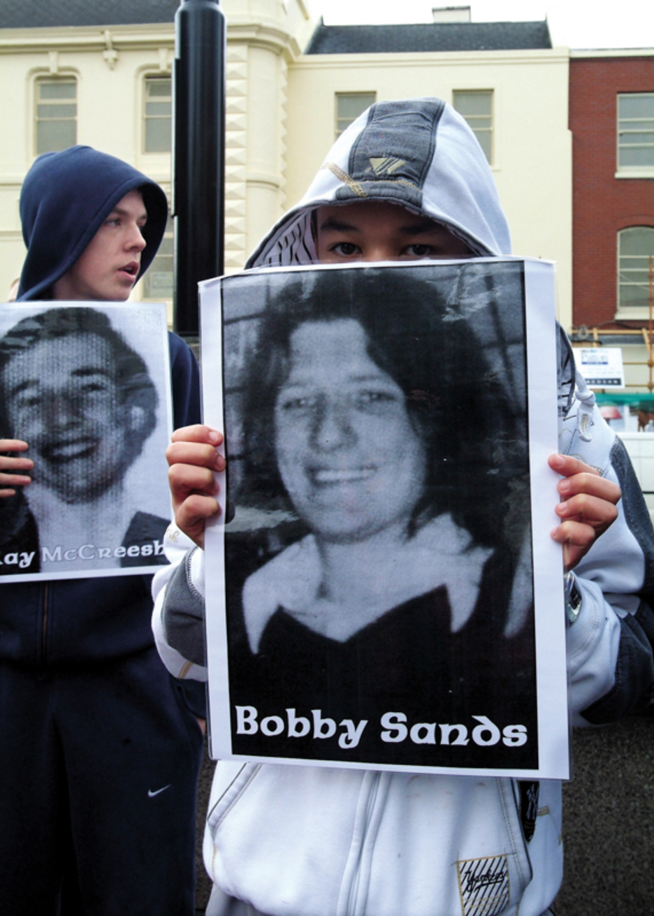 Unos adolescentes exhiben en Belfast imágenes de los huelguistas de hambre en el 25º aniversario, en 2006. (Conny Beyreuther | ZAZPIKA)