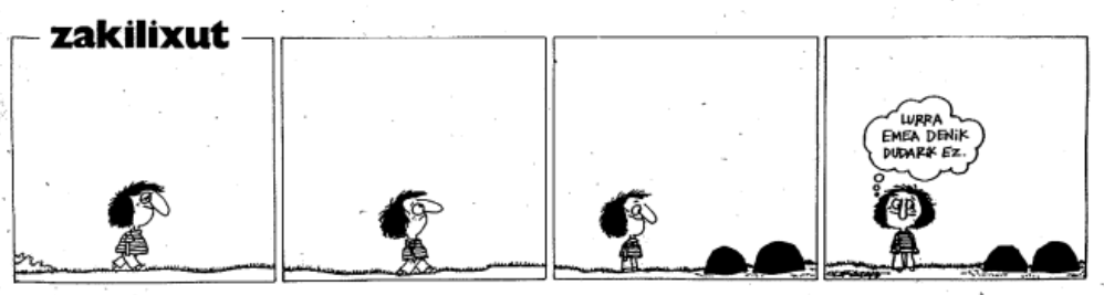 Con sus manos en los bolsillos, Zakilixut ha paseado por 'Egin' y 'Egunkaria' y, en estos días, se le ve por 'Berria'. En su debut en 'Egin' se le ve jovencísimo. Aunque, teniendo en cuenta que han pasado casi cinco décadas, se conserva estupendamente.