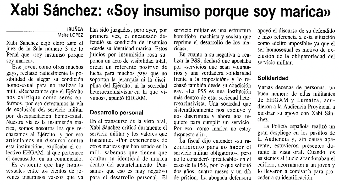 «Soy insumiso porque soy marica». Fue la frase que dijo el joven Xabi Sánchez, integrante del movimiento por la liberación sexual de Euskal Herria EHGAM, al juez de la Sala número 3 de lo Penal en Iruñea el 11 de junio de 1996. Era uno de los cientos de jóvenes vascos que fueron juzgados por negarse a realizar el servicio militar obligatorio, pero el primero, según recogió 'Egin' el día después, que defendió su condición de insumiso «desde su identidad marica».
