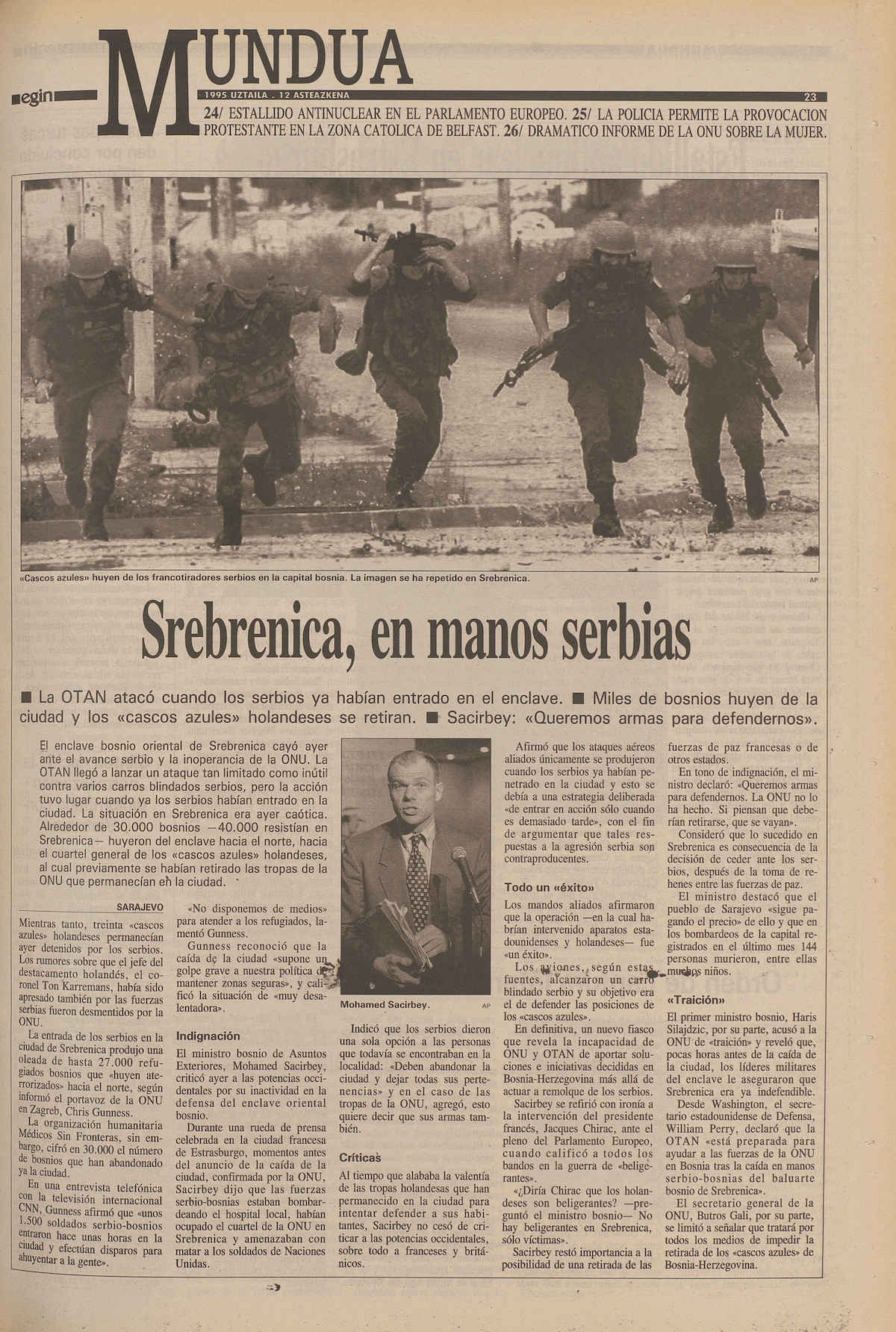 Beste asko baso eremuetatik ihes egiten ere saiatu ziren. «Srebrenica erori da», titulatu zuen 'Egin'-en azalak tipografia handiz, eta eguneko artikulua ilustratzen zuen argazkian kasko urdinak ikusten ziren korrika ihesi.