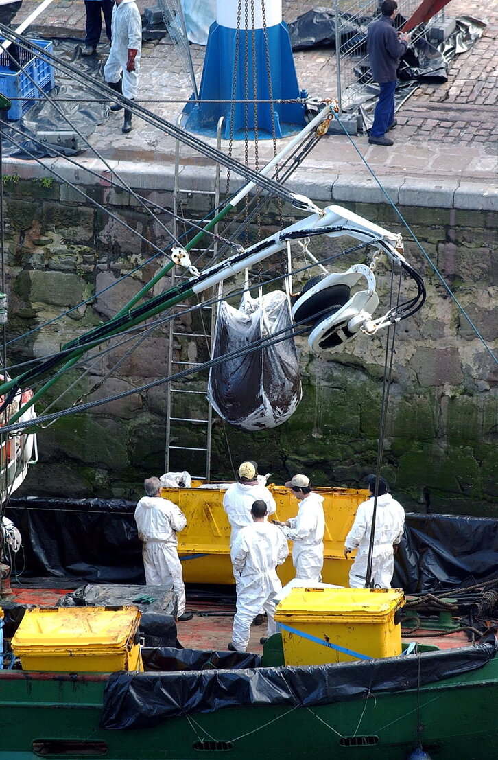 Donostiako arrantza-ontziek jasotako 'Prestige' ontziko galipota portura igotzen.