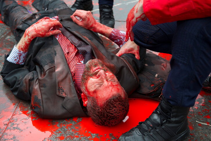 BBVAren aurkako plataformaren ekimena margo gorria isuriz odola irudikatuz Bilbon.