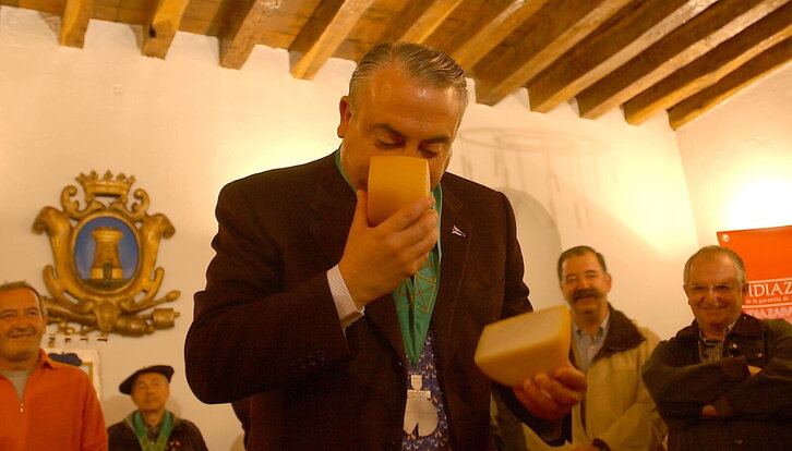Gonzalo Anton ostalaria Idiazabalgo gazta berria mozten, Argiñano, Subijana eta Arzak sukaldarien alboan.
