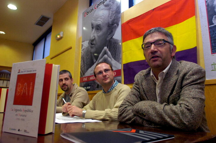 José María Jimeno Jurioren "La Segunda República en Navarra (1931-1936)" liburuaren aurkezpena. Irudiaren erdian, bere seme Roldán Jimeno.