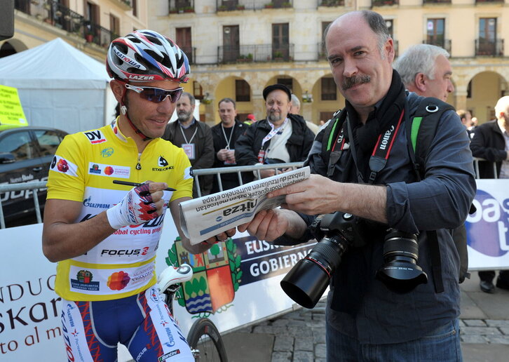 Joaquín Rodríguez 'Purito' txirindularia eta Gotzon Aranburu kazetaria, Euskal Herriko Itzulian Zumarragatik irten den etapa abiatu aurretik.