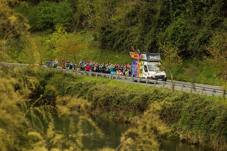 Euskal Herriko Itzulia abiatu da. Irudian, tropela Deskargako portuan Urretxurantz joaten.