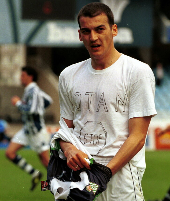 Darko Kovacevic Realeko jokalariak NATOren bonbardaketen aurkako kamiseta erakutsi du.