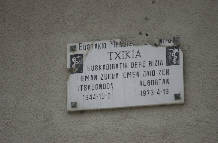 Tiroen markak ageri dira Eustakio Mendizabal 'Txikia'ren omenezko plakan.