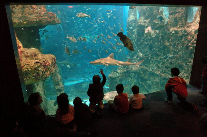 Haurrak marrazo bati begira Donostiako Aquariumean.