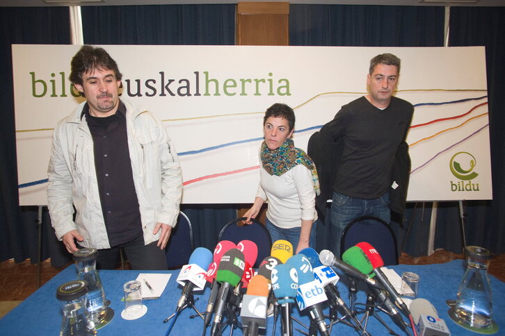 Bilduren prentsaurrekoa Donostian. Irudian, ezkerretik eskuinera, Pello Urizar, Mertxe Aizpurua eta Oskar Matute.