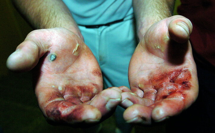 Iker Gorriti aizkolariaren zauritutako eskuak Leon Albenizen aurkako desafioa irabazi ostean.