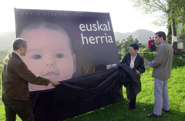 Maiatzaren 13ko hauteskundeak. Euskal Herritarrok taldeko Antton Morcillo, Jone Goirizelaia eta Arnaldo Otegi kanpainarako kartela erakusten Ajangizen.