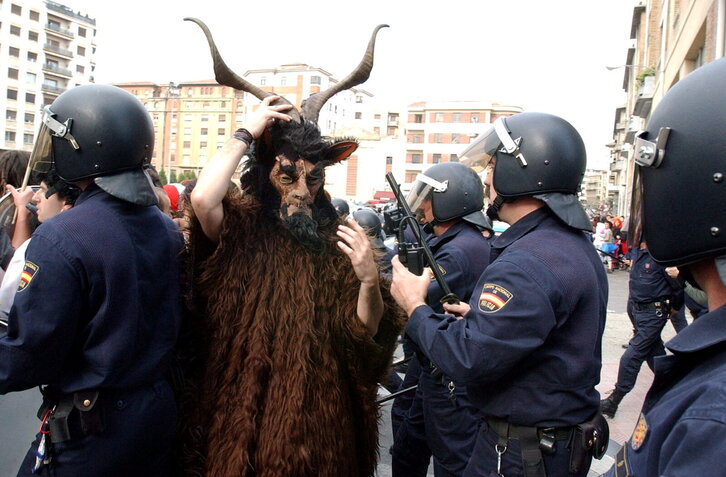 Espainiako Poliziaren oldarraldia Hemen eta Munduan plataformaren aurka Iruñean. Irudian, protestak Europar Batasuneko ministroek energiaren inguruan edukitako bileraren aurka.