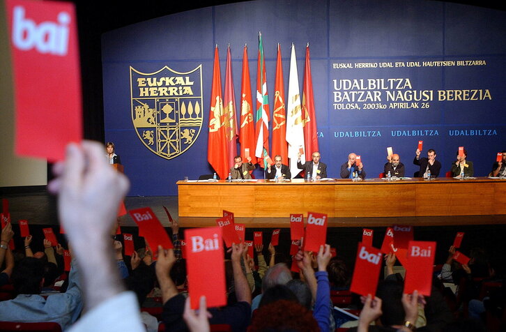 Udalbiltzaren Batzar Nagusia Tolosako Leidor aretoan. Irudian, Antton Izagirre, Lander Etxebarria, Josu Barandika, Pablo Gorostiaga, Oskar Goñi eta Loren Arkotxa.